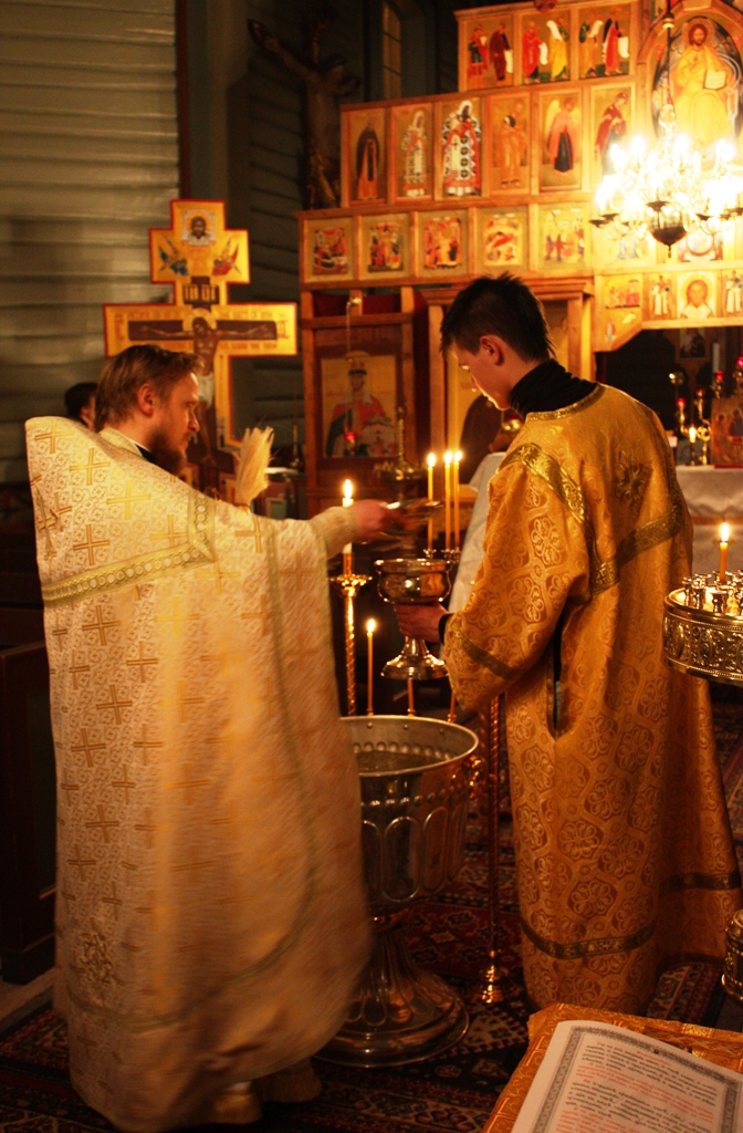 После этого, при многократном пении тропаря певцами, настоятель с Крестом в левой руке кропит крестообразно во все стороны, а также окропляет святой водой храм. Прославление праздника