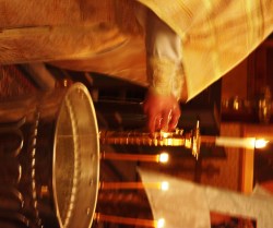 После этого — ектенья «Рцем вси…» и прочее. Великое освящение воды Воспоминание Иорданского события Церковь обновляет особым чином великого освящения воды. В Навечерие праздника великое освящение воды бывает после заамвонной молитвы (если совершается литургия св. Василия Великого). А если вечерня совершается особо, без соединения с литургией, освящение воды бывает в конце вечерни, после возгласа: «Буди держава…». Священник через царские врата при пении тропарей «Глас Господень на водах…» выходит к сосудам, наполненным водой, неся на главе Честный Крест, и начинается освящение воды.