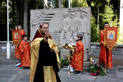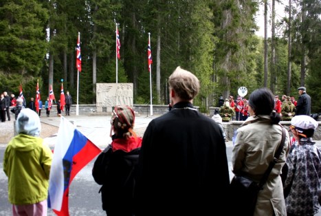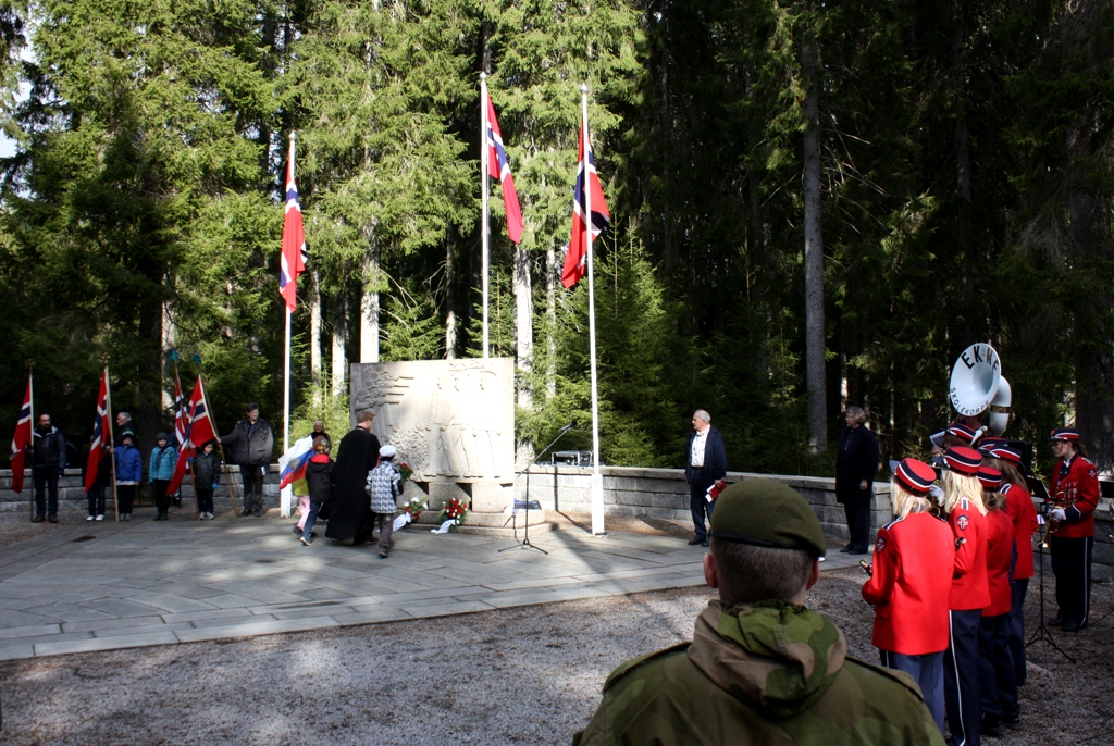 «Со святыми упокой, Христе, души усопших раб Твоих, приснопамятных вождей и воинов, за веру и Отечество на поле брани жизнь свою положивших, от ран и глада скончавшихся, в пленении и горьких работах невинно умученных и убиенных и всех, Победы ради потрудившихся». В лесу Фалстада приводились в исполнение приговоры о казни заключенных. На памятном камне с картой участков леса, где были расстреляны узники концлагеря, указано: 205 здесь было убито, среди которых 43 норвежца, 101 русский и 61 югослав, из числа которых неизвестны имена 33 югославов и 86 русских. Найдены далеко не все захоронения с расстрелянными узниками. Официальная торжественная церемония в честь Дня Победы началась гимном Норвегии.