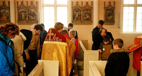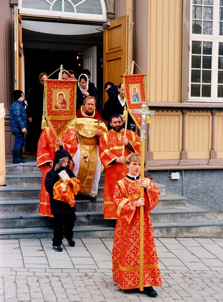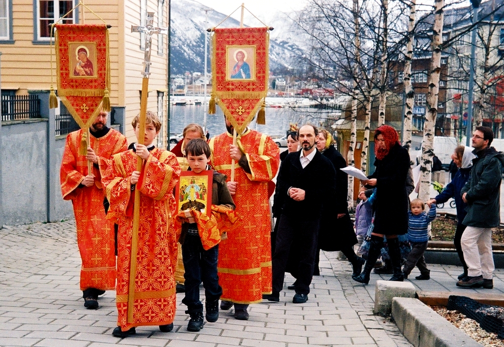 ХРИСТОС ВОСКРЕСЕ!!! В субботу на Светлой седмице в русской православной общине крупнейшего города Северной Норвегии Тромсе прошли пасхальные торжества, главным событием которых стала Божественная литургия по пасхальному чину, отслуженная иереем Александром из Тронхейма. Под многоголосое и сплоченное пение жизнеутверждающего «Христос воскресе!» был совершен крестный ход в центре города вокруг храма с открывающимся видом на известный своим архитектурным своеобразием «Собор Ледовитого океана», расположенный на другом берегу фьорда. Яркое праздничное шествие верующих с хоругвями вызвало заметный интерес у жителей «Северного Парижа» (как порой именуют Тромсе), прогуливающихся в выходной день по центральной площади. Светлая суббота по традиции завершилась общей праздничной трапезой.