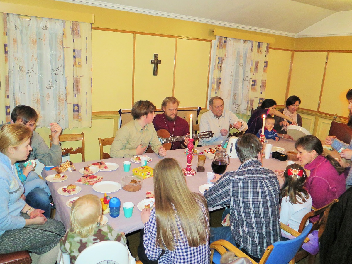 Затем все собрались за общей трапезой, где батюшка исполнил православные песни под гитару.