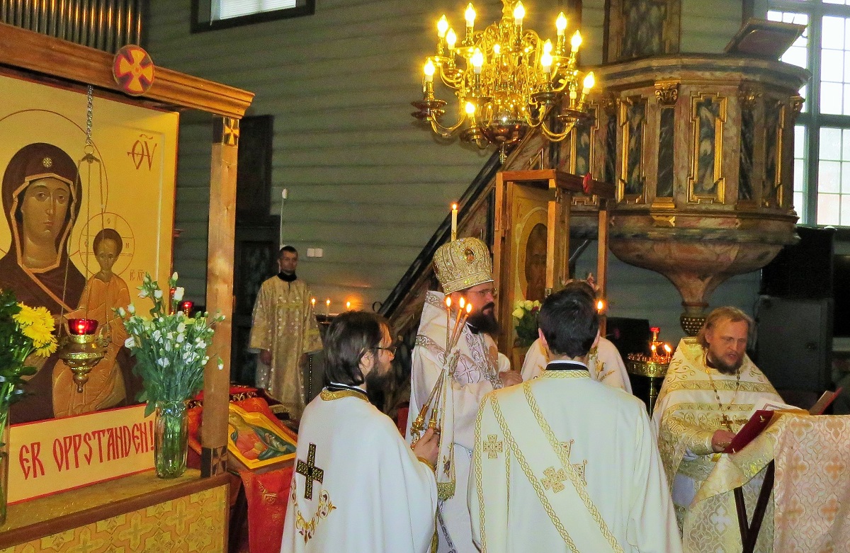 Владыка Макарий возглавил соборное служение Божественной литургии по Пасхальному чину, в числе сослужившего духовенства — и настоятель прихода Московского Патриархата в Тронхейме иерей Александр Волохань.