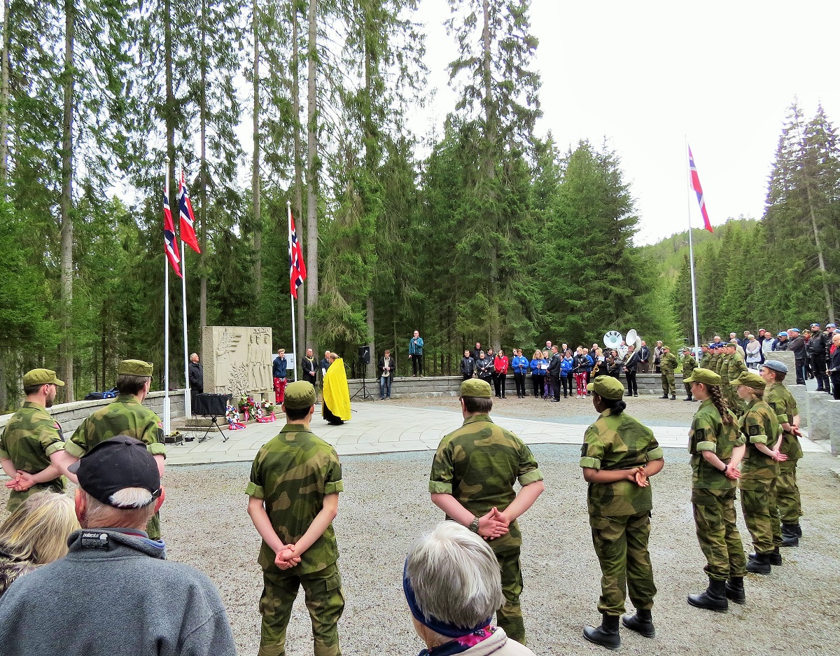 Мэр Левангера, ветераны, школьники, оркестр, местное население, представители Союза офицеров Норвегии, солдаты Министерства обороны, байкеры, священник русского православного прихода в Тронхейме и прихожане. Панихида и возложение цветов.