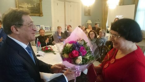 Посол Т.О.Рамишвили вручил директору Центра русского языка и культуры Т.В.Рейерсен государственную награду России – медаль Пушкина за большой вклад в области сохранения русского языка за рубежом.