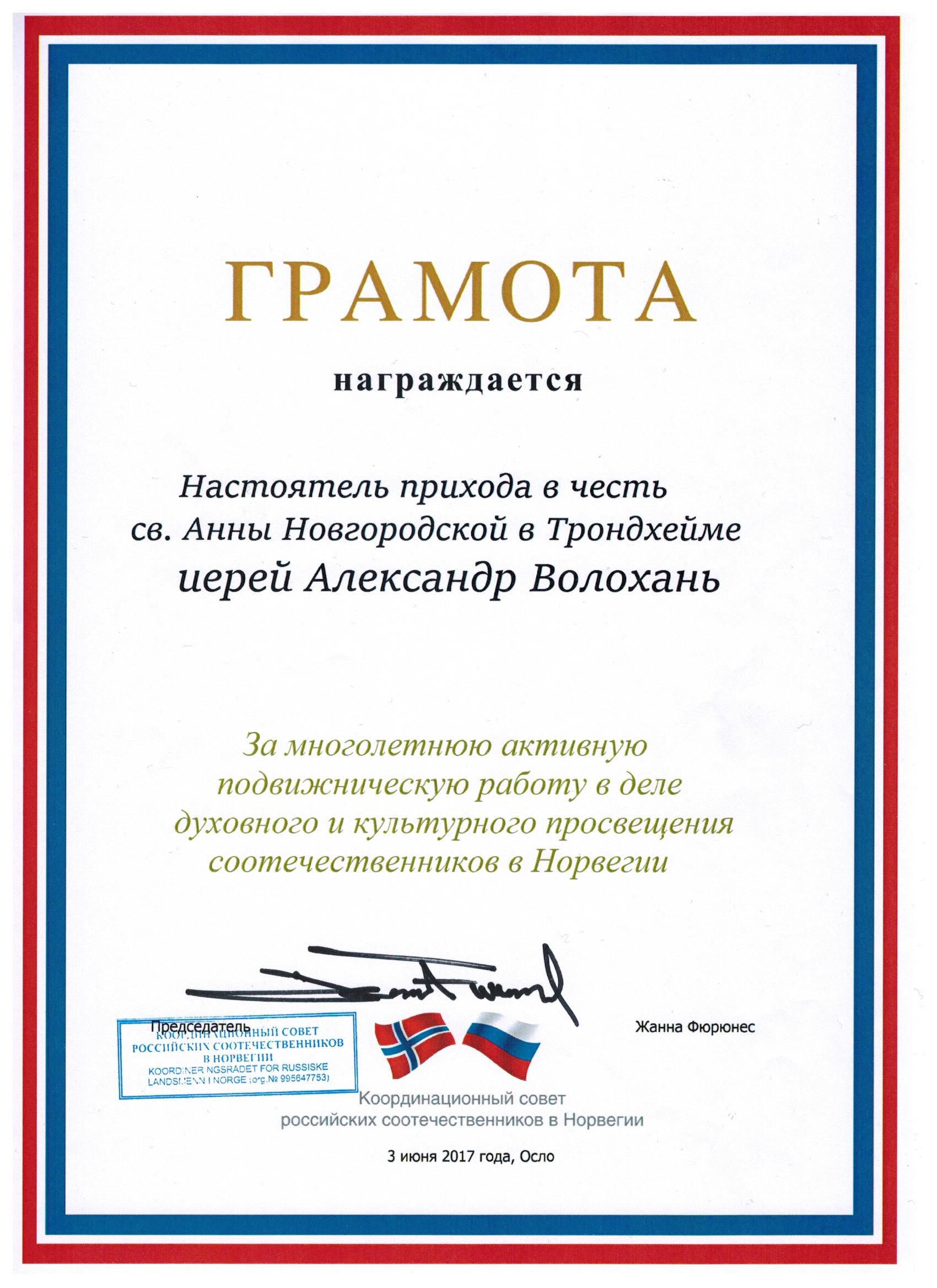 Настоятель прихода в Тронхейме рассказал о развитии и деятельности приходов Русской Православной Церкви в Норвегии, а также их значимой роли в деле единения соотечественников в диаспоре (эмиграции), сохранения ими религиозной и культурной идентичности. Председателем Координационного совета Жанной Фюрюнес священнику Александру Волоханю была вручена Грамота за многолетний вклад в дело духовного и культурного просвещения соотечественников в Норвегии.
