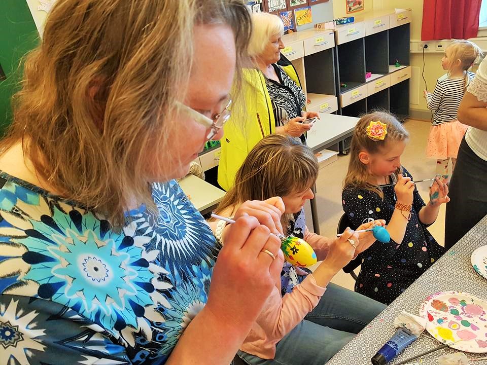 Рассказ священника о Воскресении Христовом и праздничной иконе Сошествия Господня во ад. Вопросы и рассуждения детворы. Многократное и дружное пение «Христос Воскресе». И, конечно, творческая мастерская по расписыванию пасхальных яиц. Общими усилиями ребят и родителей радость наша становится совершенной!