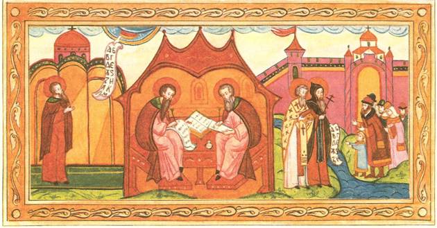 Батюшка Александр провел беседу с детьми, рассказав им о житии равноапостольных солунских братьев, а также порассуждав вместе с ребятами о значении слова в жизни человека, о славянской письменности, кириллице, о церковно-славянском языке богослужения и важности для человека молиться на родном языке.