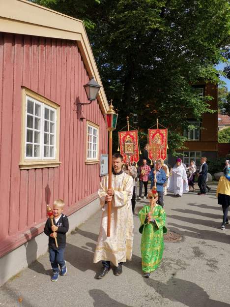 После Божественной литургии состоялся крестный ход у стен приходского храма Бакке кирке, по окончании которого были освящены принесенные плоды, яблоки и виноград.