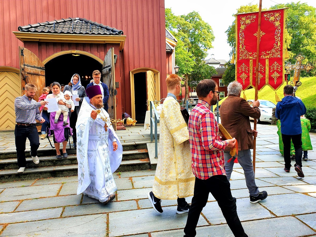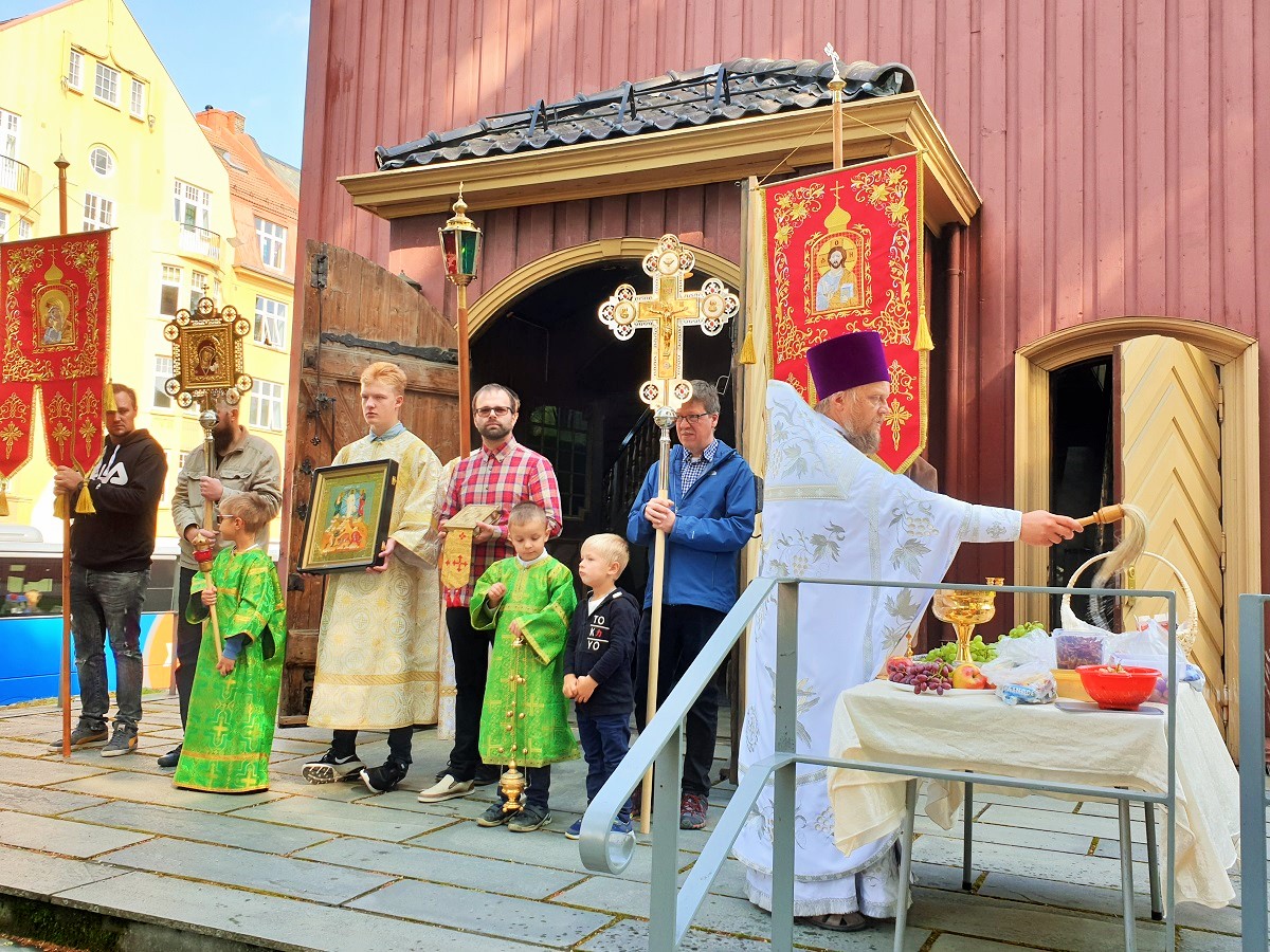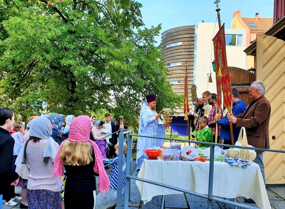 После Божественной литургии состоялся крестный ход у стен приходского храма Бакке кирке, по окончании которого были освящены принесенные плоды, яблоки и виноград.