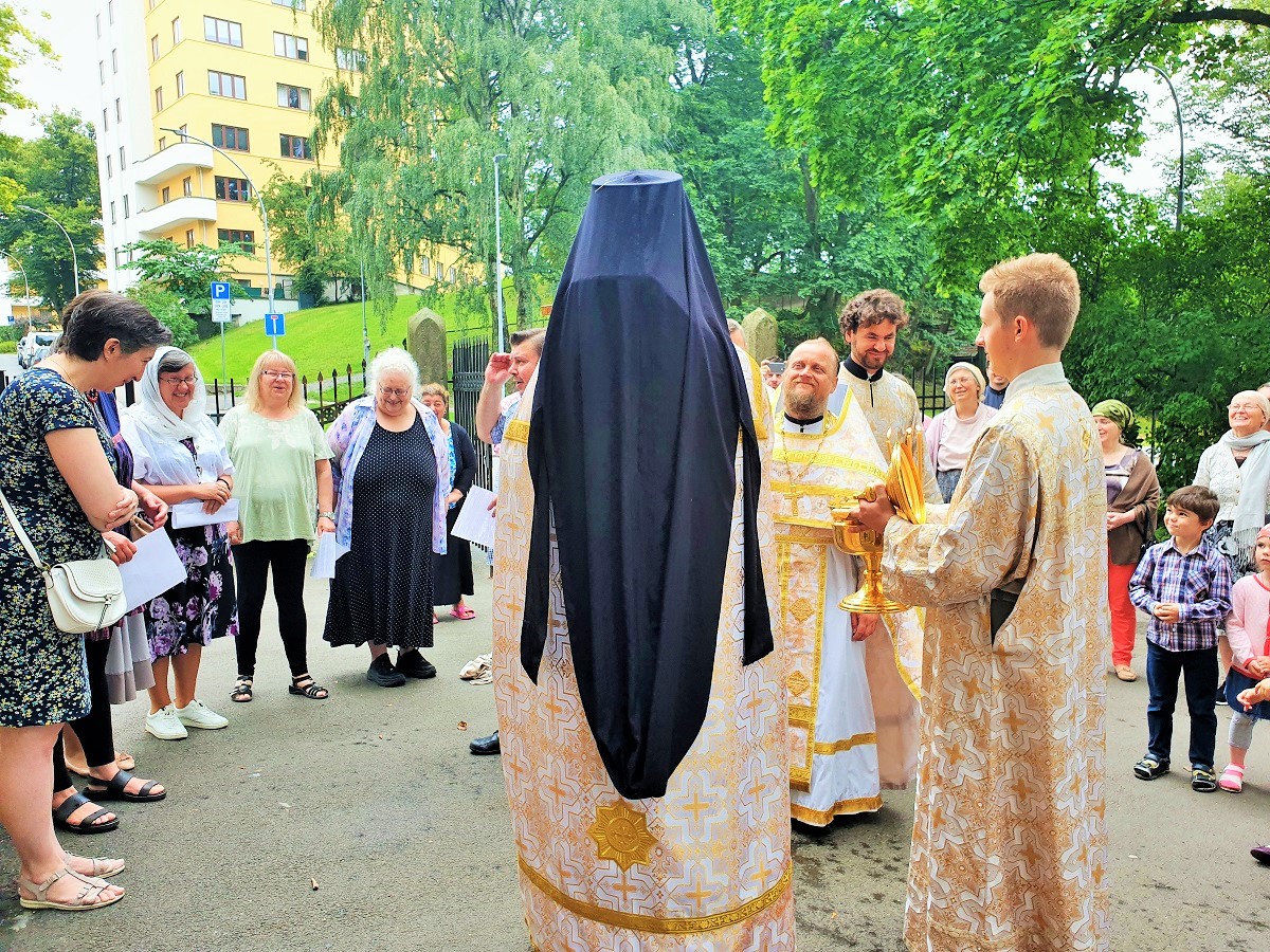 Благочинный приходов Московского Патриархата в Норвегии поздравил всех молящихся с праздником и отдельно поблагодарил служившее духовенство за соборную молитву. В свою очередь иерей Александр Волохань в ответном слове поздравил настоятеля и прихожан с днем памяти небесной покровительницы прихода в Осло и сердечно поблагодарил отца Климента за гостеприимство и важную возможность сослужения, вручив ему в знак молитвенного единства верующих и духовенства обоих приходов Крест с изображением Воскресения Христова — Сошествия Господня во ад с изведением Адама и Евы из глубин преисподней.