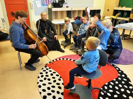 Папой одного из учеников воскресной школы, Георгием, были с воодушевлением исполнены для ребят музыкальные произведения известных композиторов на виолончели.