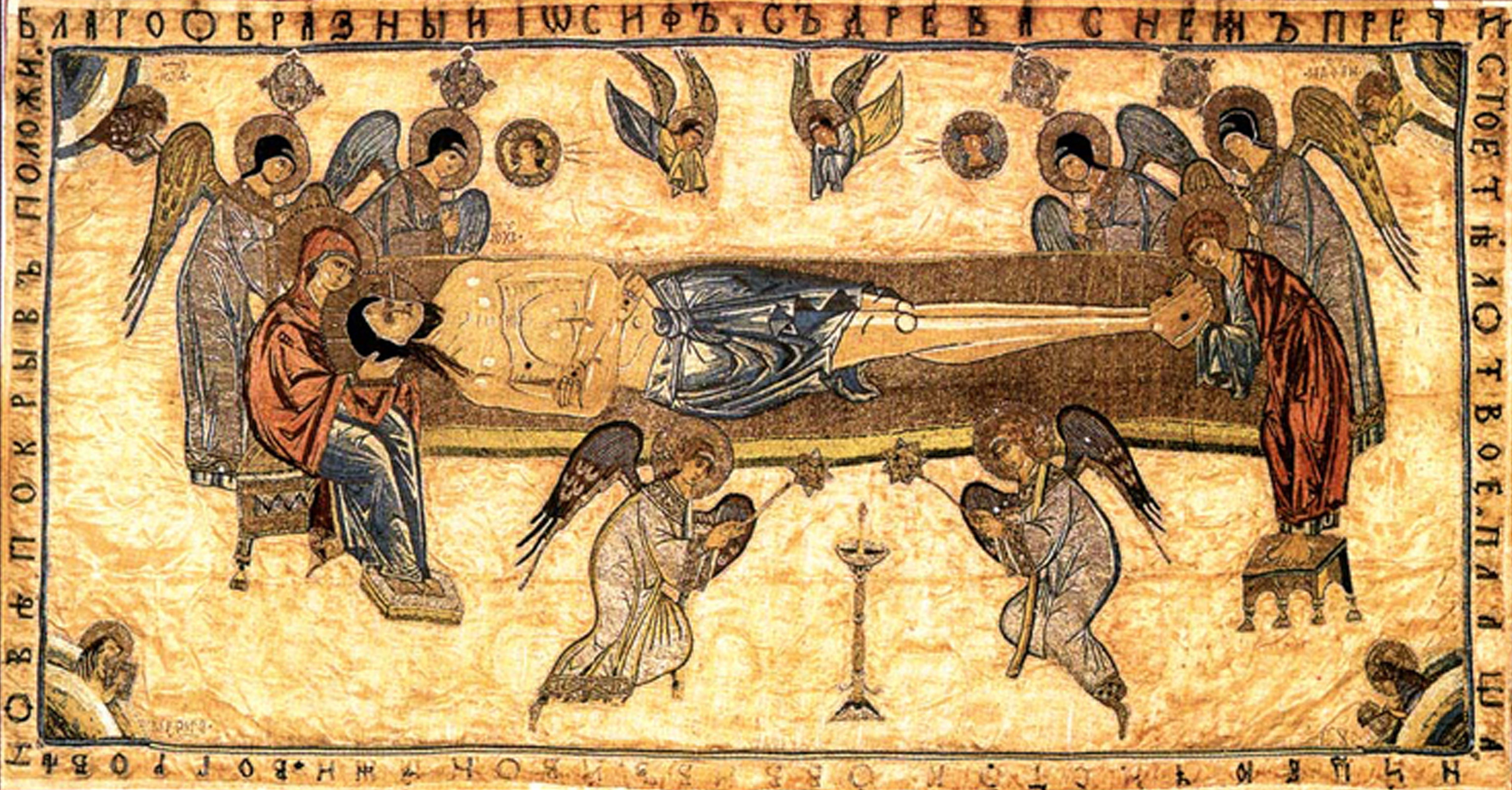 Мироносицам женам при гробе представ, Ангел вопияше:/ мира мертвым суть прилична,// Христос же истления явися чуждь.