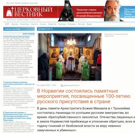 В субботу 21 ноября, в день памяти Архистратига Божия Михаила, в г.Тронхейме настоятелем прихода святой княгини Анны Новгородской иереем Александром Волоханем была отслужена панихида по усопшим первым русским эмигрантам, во время «братоубийственного лихолетья Отечества лишенных и в земле Норвежстей прибежище и упокоение обретших, всех в годину гонений от безбожной власти за веру невинно замученных и убиенных».