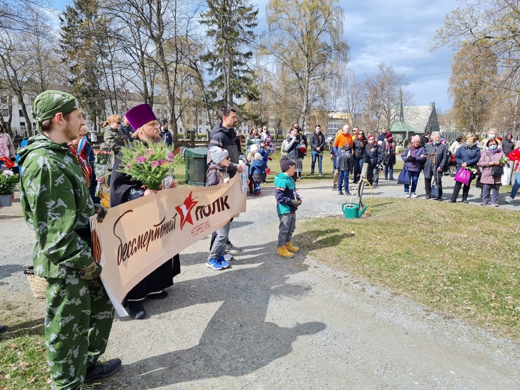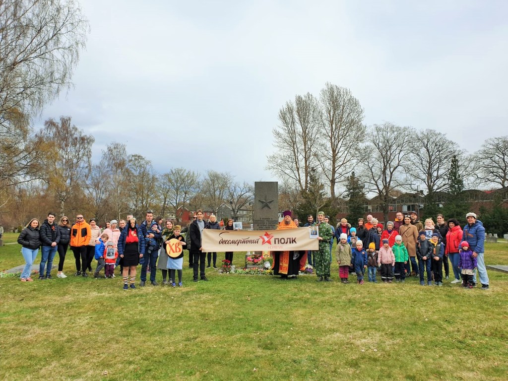 Поначалу прошло шествие «Бессмертного полка», возглавляемое священником Александром Волоханем, собравшее более 100 соотечественников, празднично украсивших свою одежду Георгиевскими ленточками и несших портреты ветеранов, своих дедов и прадедов, бабушек и прабабушек с пением песен военных лет и Пасхальных песнопений прихожанами.